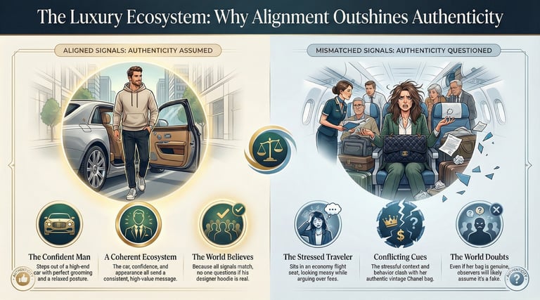 Luxury is a lifestyle, not a label. Don’t just collect expensive things; curate a high-value environment. If your signals (grooming, confidence, context) are in alignment, your authenticity is never questioned. Status is signaled by the whole, not the parts.