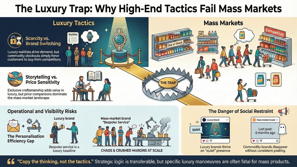 Know your game. If you sell a commodity, focus on visibility, speed, and consistency. Save the waitlists and the quiet social media for when you are selling heritage and high-end craft. Don’t let the luxury label blind you to the reality of your market.